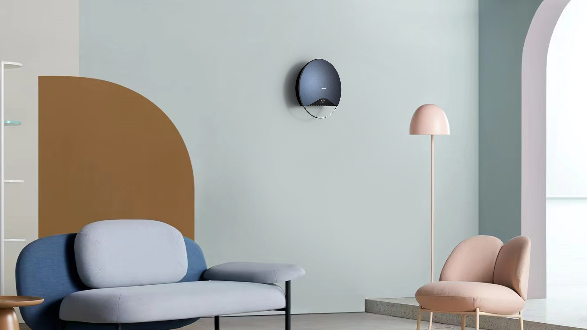 下方的弧形金屬桿兼顧功能性與設(shè)計感。實用性極強的同時在造型上與整體的圓形造型設(shè)計語言緊密呼應(yīng)。