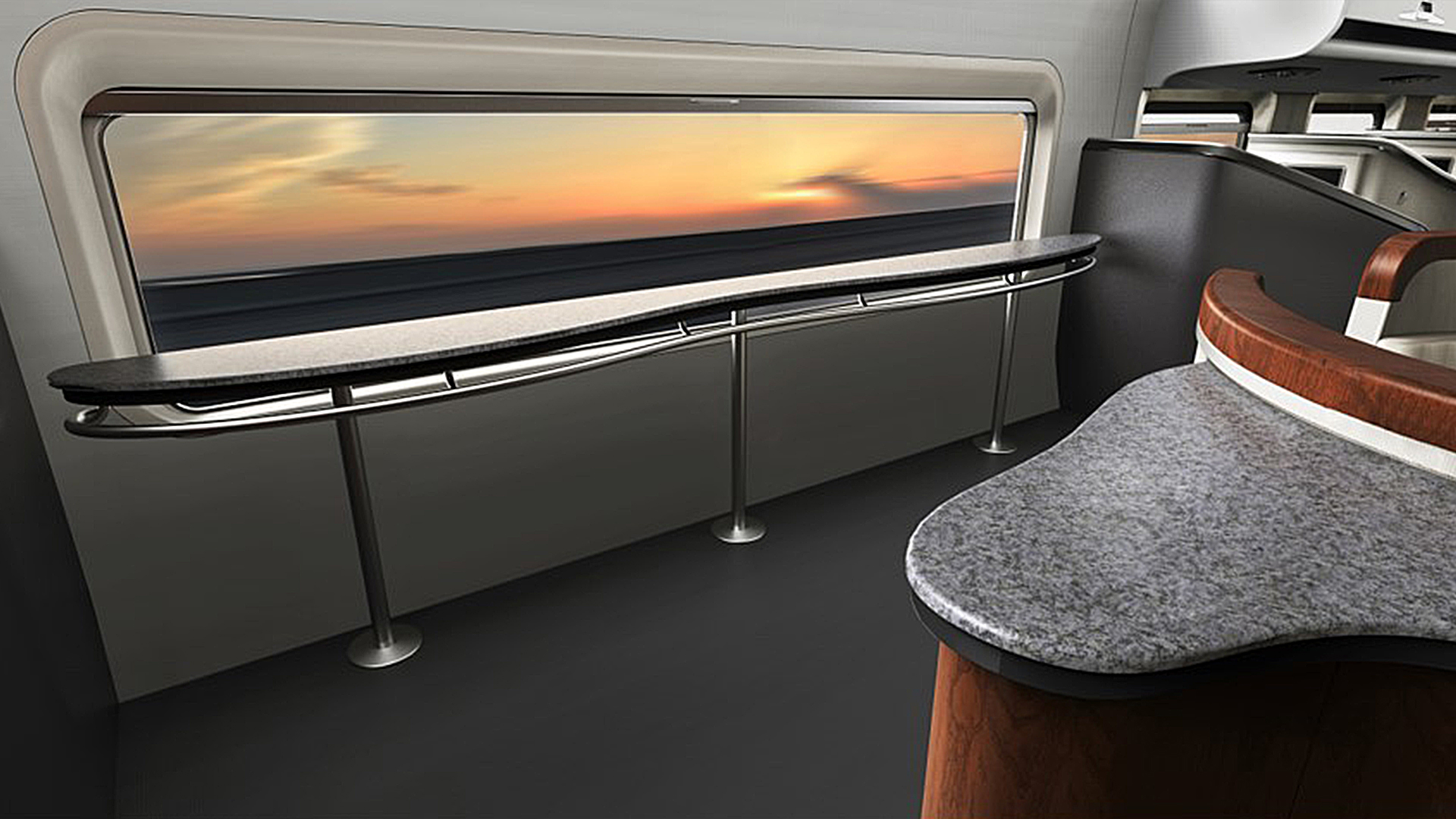 獨(dú)立的私人空間,科技感十足的乘坐休息區(qū)、全景觀景視窗、公共大空間會(huì)談區(qū),成為該方案的設(shè)計(jì)特色。每個(gè)位置都有對(duì)應(yīng)的大玻璃窗,可以方便的欣賞到窗外的景色,加之車(chē)廂內(nèi)的燈光效果,渲染浪漫星空,讓每次出行氛圍都成為一種享受!