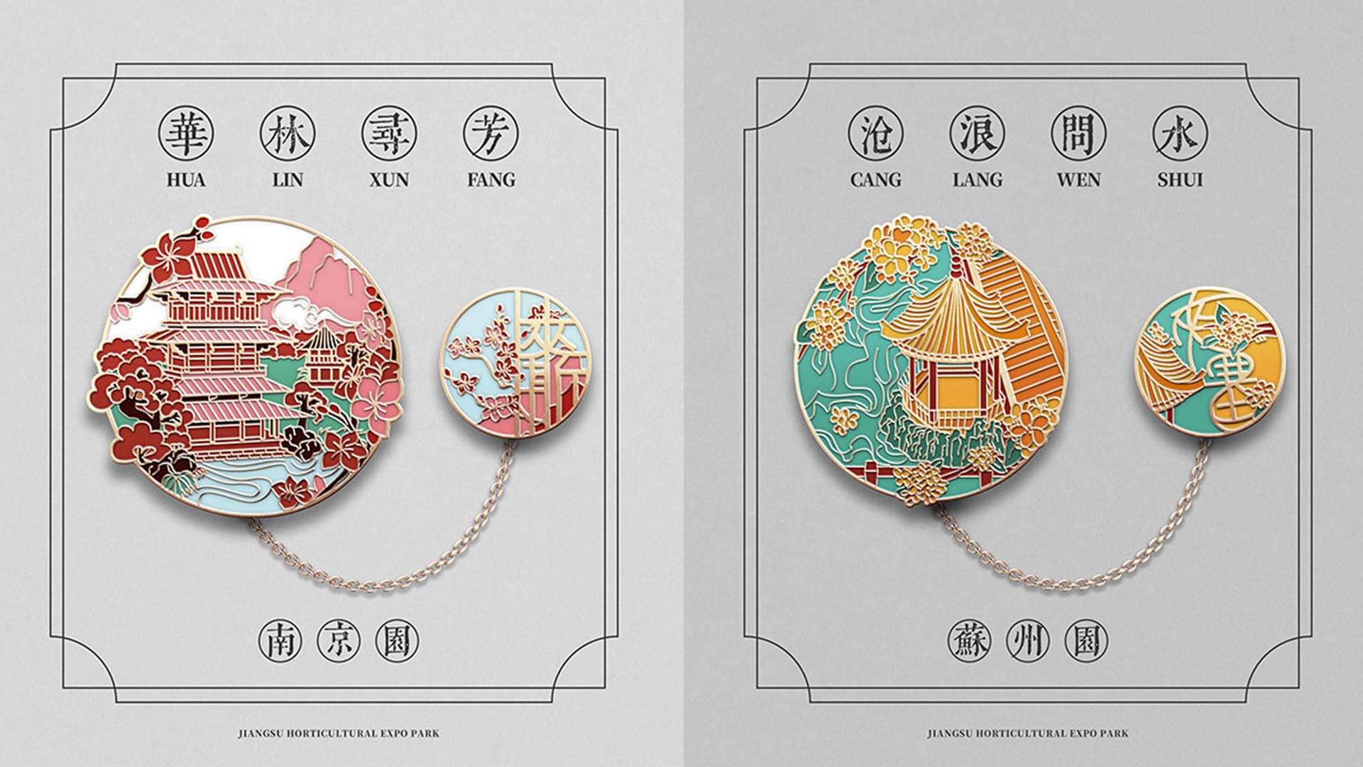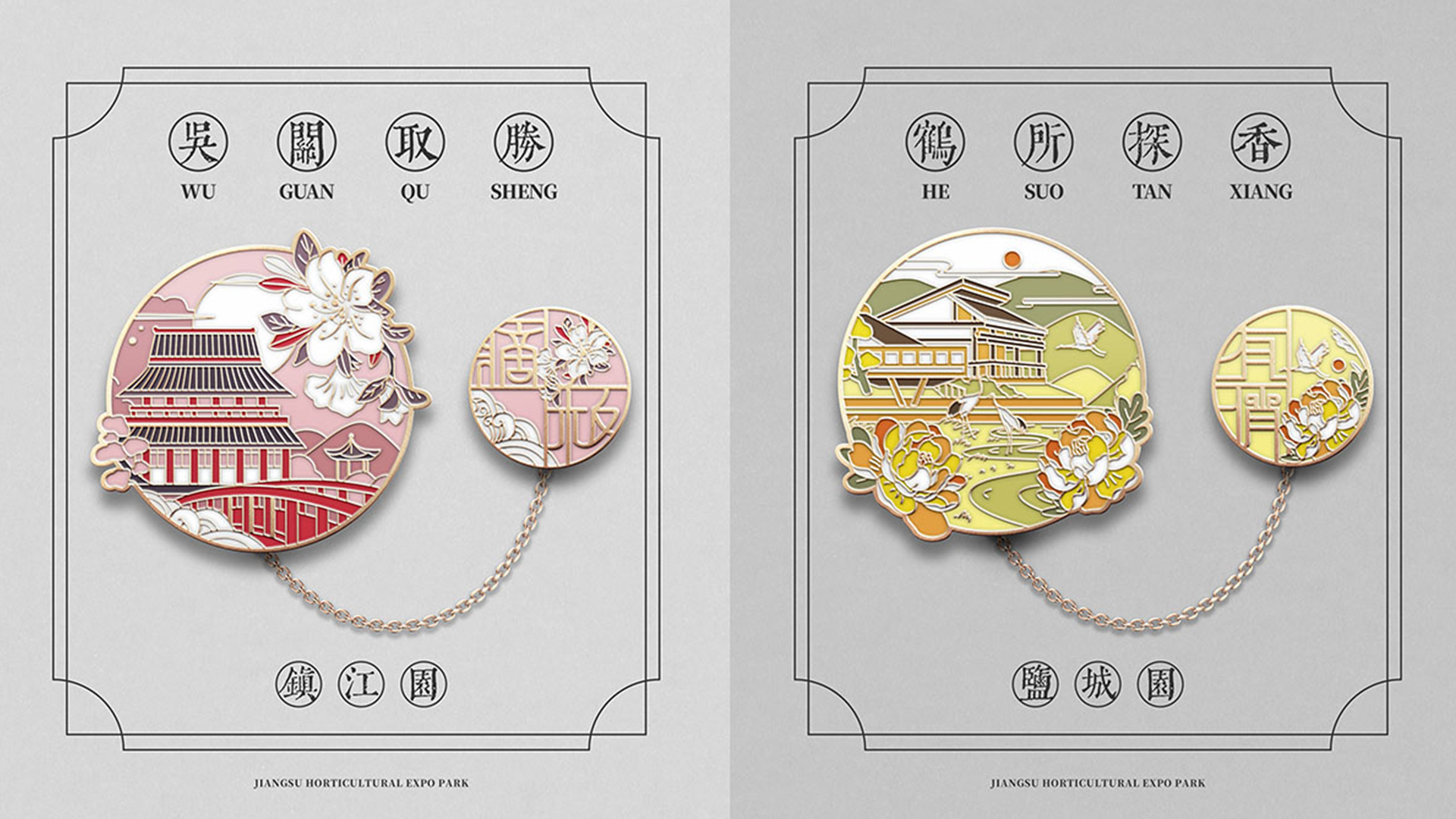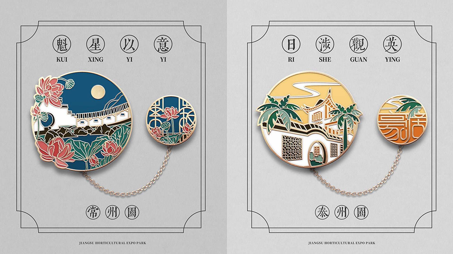 蘇韻薈谷·文創(chuàng)徽章:蘇韻薈谷徽章系列以江蘇省十三市經(jīng)典園林建筑為靈感,分別融入各地代表美好寓意的特色方言,從傳統(tǒng)園林窗花切入,運用視覺立體化手法,形成具有地方特色的徽章視覺體系。