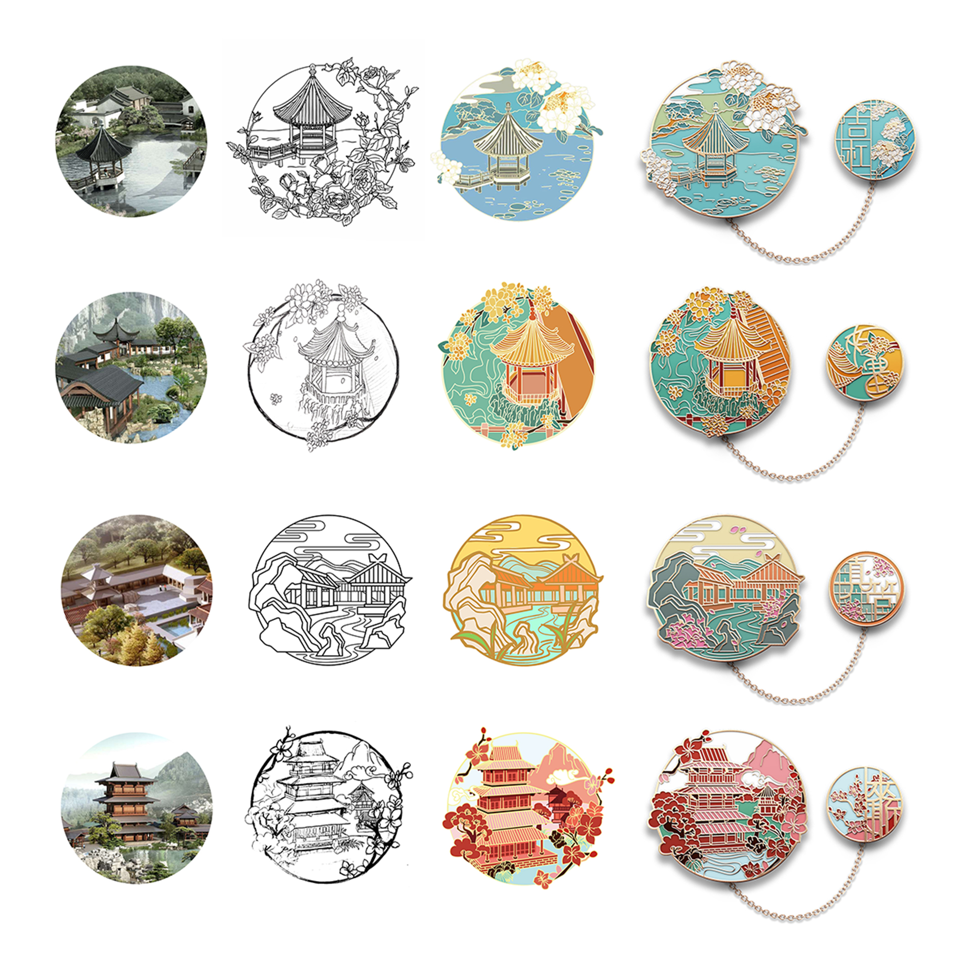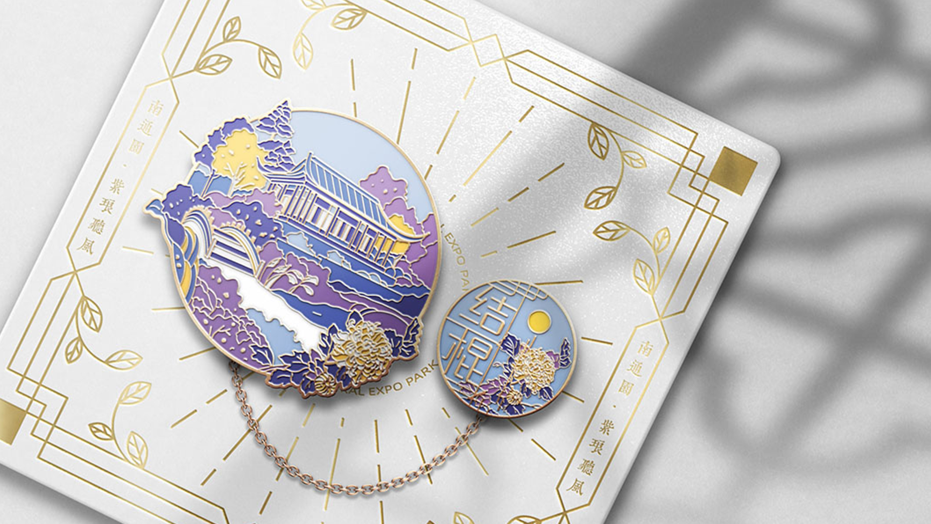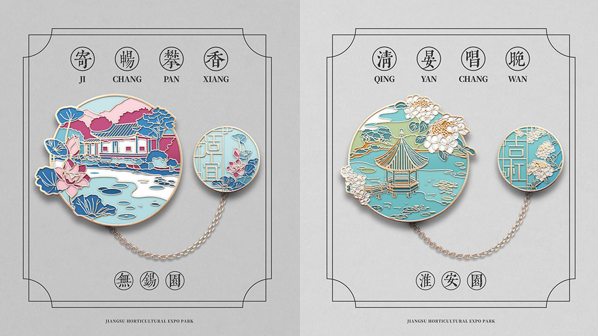 蘇韻薈谷·文創(chuàng)徽章:蘇韻薈谷徽章系列以江蘇省十三市經(jīng)典園林建筑為靈感,分別融入各地代表美好寓意的特色方言,從傳統(tǒng)園林窗花切入,運用視覺立體化手法,形成具有地方特色的徽章視覺體系。