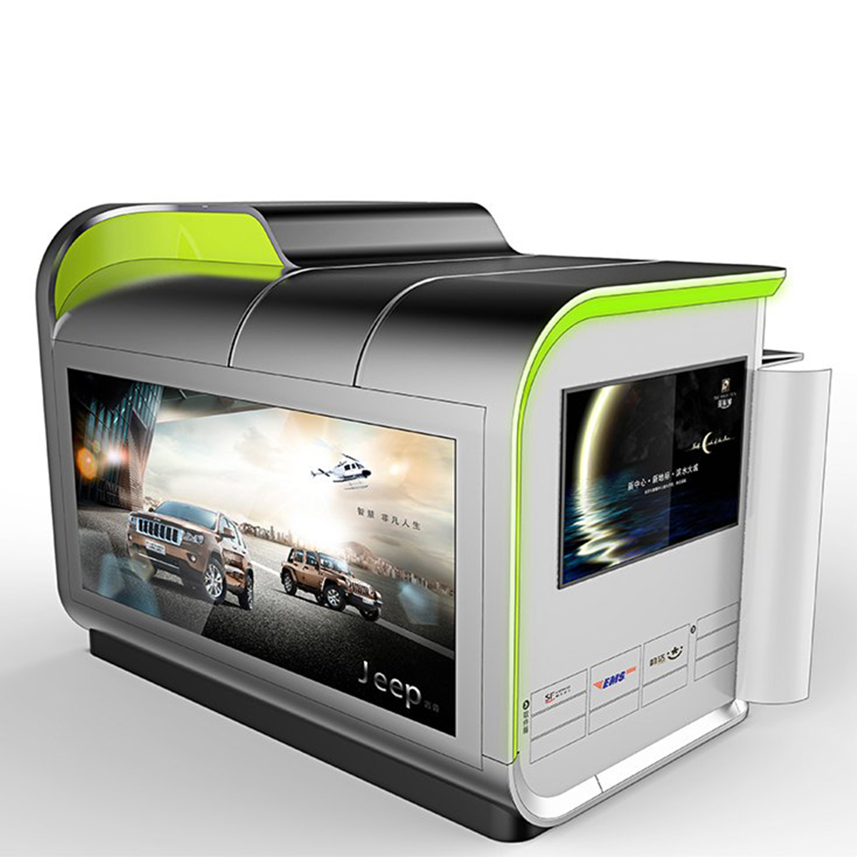 造型以現(xiàn)代簡約風(fēng)格為主,順應(yīng)現(xiàn)代市場和審美需求。簡潔的外觀、內(nèi)部流暢的曲線和燈光效果相呼應(yīng),凸顯產(chǎn)品的科技感同時又不顯得沉悶。多功能和模塊化設(shè)計更是人性化設(shè)計的主要體現(xiàn),由形式至意,從意到神韻,無不強調(diào)中國郵政的服務(wù)宗旨,以人為本。
