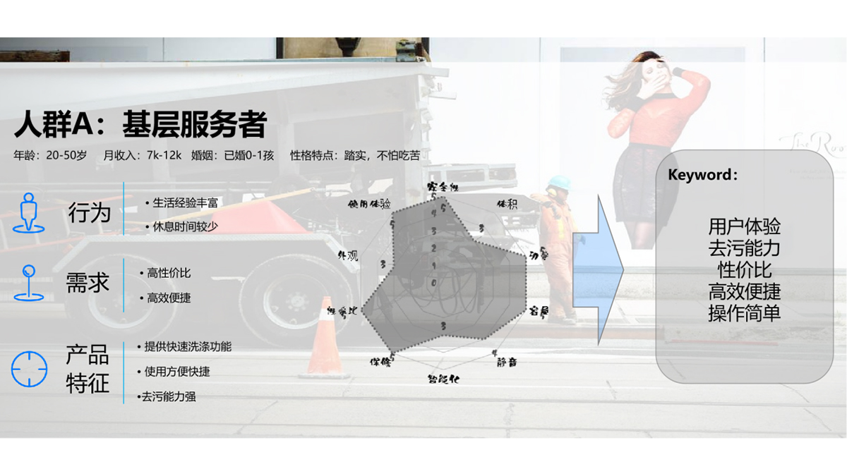 ? ? ? ? 滾筒洗衣機(jī)的普及很大程度擴(kuò)大了用戶(hù)群體,這要求團(tuán)隊(duì)需要從多個(gè)維度對(duì)人群進(jìn)行劃分和了解。從角色數(shù)據(jù)的角度,不同的職業(yè)決定了收入層次及消費(fèi)能力,從而影響滾筒洗衣機(jī)的定價(jià)。木馬團(tuán)隊(duì)深入研究劃分消費(fèi)者族群,將其分為基層服務(wù)者、非技術(shù)白領(lǐng)及商業(yè)服務(wù)業(yè)三類(lèi),分別剖析了者三類(lèi)人群對(duì)于洗衣機(jī)的不同需求,并制作用戶(hù)畫(huà)像,如下圖。