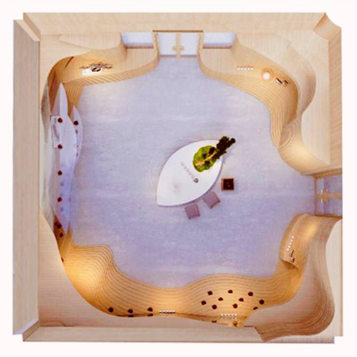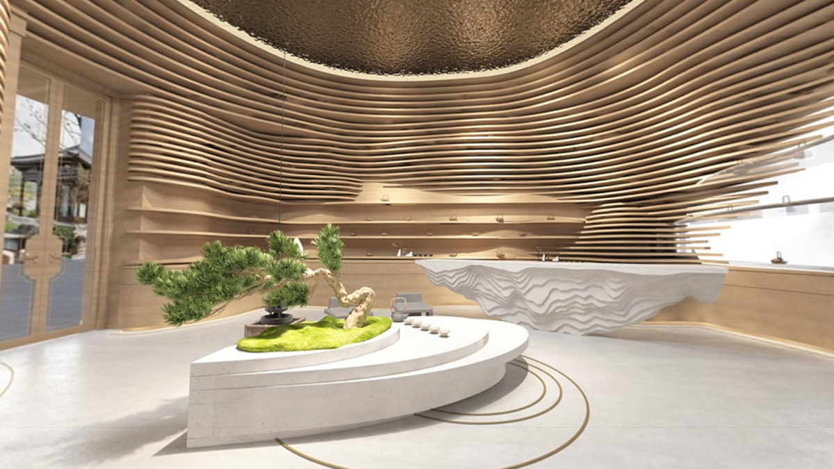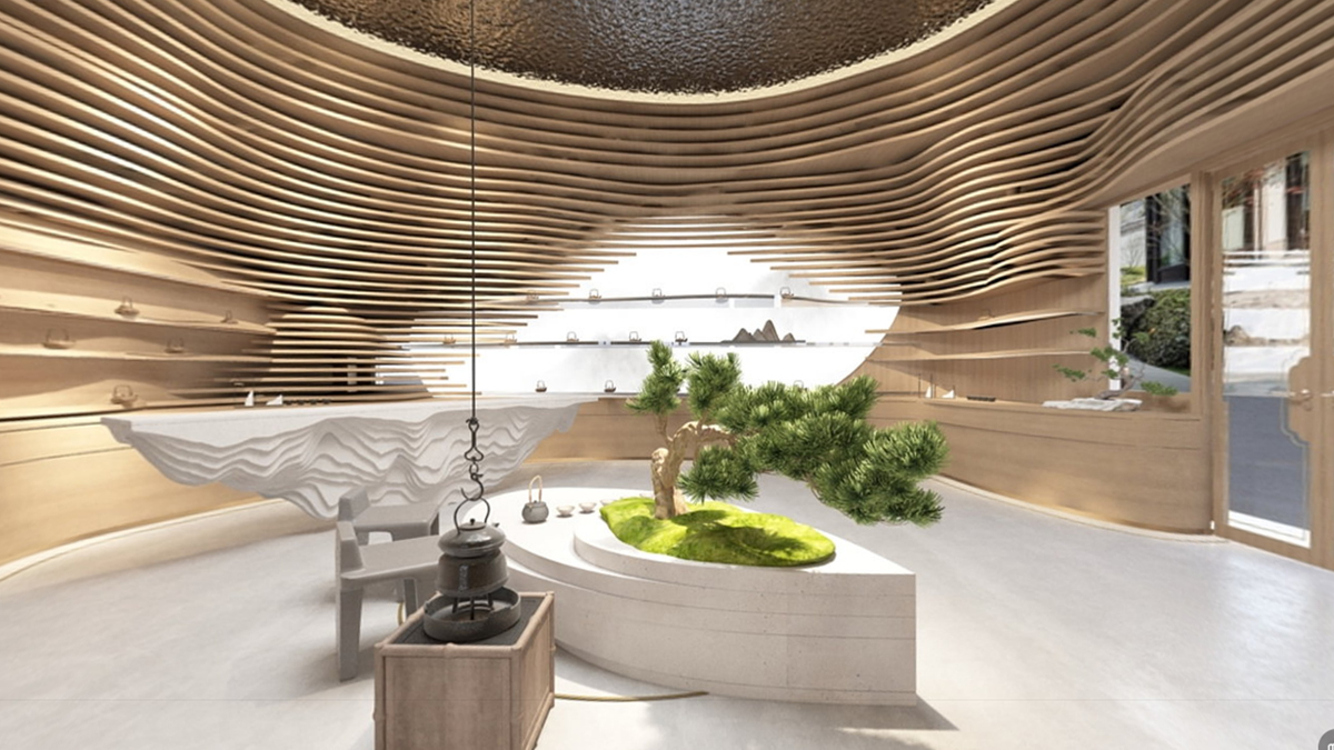 整體空間的靈感來自于自然地形——梯田, 所塑造的自然成型的層次。決定了人與動(dòng)物行走,相遇,交談,互動(dòng)的生態(tài)。茶葉本身也是從這個(gè)大自然采集而來,整體思路是希望空間能夠跳脫常規(guī)四四方方的死板規(guī)范,因?yàn)槲覀兊氖澜缡橇鲃?dòng),曲面,不定性的?;貧w自然,我們本該將自然界元素融會(huì)貫通,改變我們體驗(yàn)商業(yè)跟人互動(dòng)的形態(tài),才能從底層反應(yīng)茶這件事請(qǐng)的本質(zhì)。